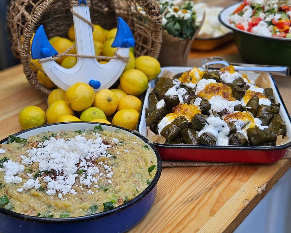 - עלי גפן ממולאים באורז לימוני על מצע צזיקי ולימונים כבושים